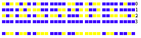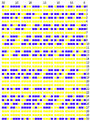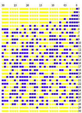 binaire, et les carrés blancs représentent des zéros. La première ligne est le résidu V25; les 31 premières lignes numérotées de 0 à 30 figurent le carré de V25; les quatre lignes numérotées 0, 1, 2, 3 au bas de la figure donnent l'addition des unités de chaque colonne, avec les reports; on a retranché 2, ou l'unité de la deuxième colonne à droite; enfin la dernière ligne est le résidu de V26.
